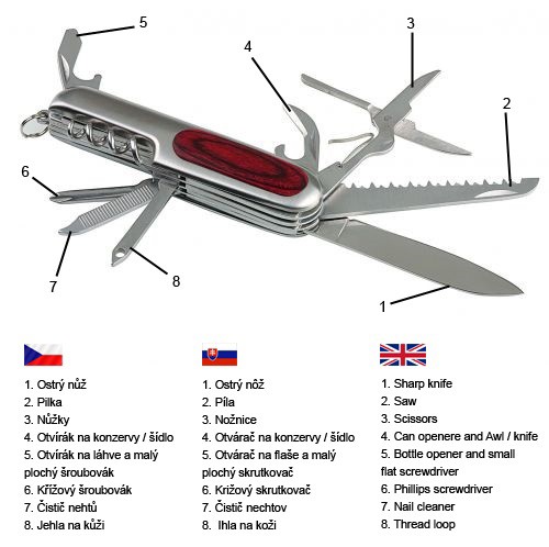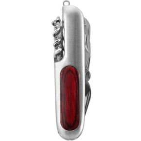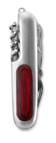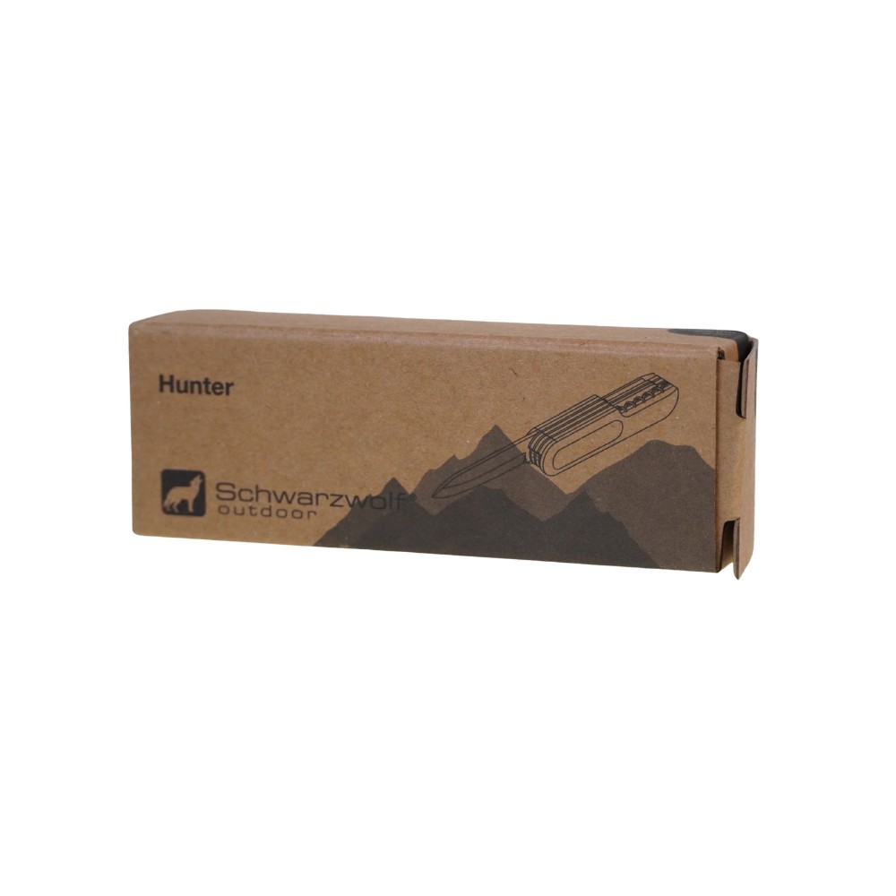 Taschenmesser mit 9 Werkzeugen, Metall/Holz. Verpackt in einer Schwarzwolf outdoor Geschenkbox. Abmessungen im geschlossenen Zustand: 9,3 × 2,5 × 1,7 cm.