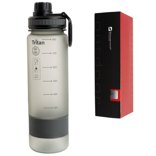 Graue Tritan Trinkflasche mit einer angenehmen, samtigen Oberfläche. Die Trinkflasche ist aus fortschrittlichem Tritan Copolyester und somit BPA (Weichmacher) frei, dabei extrem leicht, geschmacksneutral, lebensmittelecht, wärmebeständig und bruchsicher. Getränke mit einer Temperatur zwischen -10 und 80°C können bedenkenlos verwendet werden. Das Silikonband im unteren Bereich der Flasche vermittelt einen sicheren Griff. Verpackt in einer Schwarzwolf outdoor Geschenkbox. Material: Tritan. Volumen: 0,8 l. Abmessungen: O 7,3 × 27 cm.