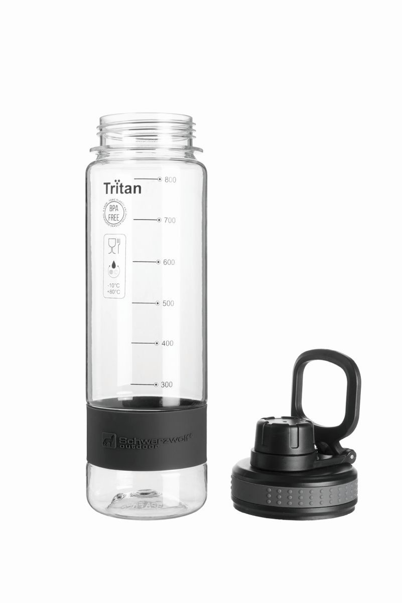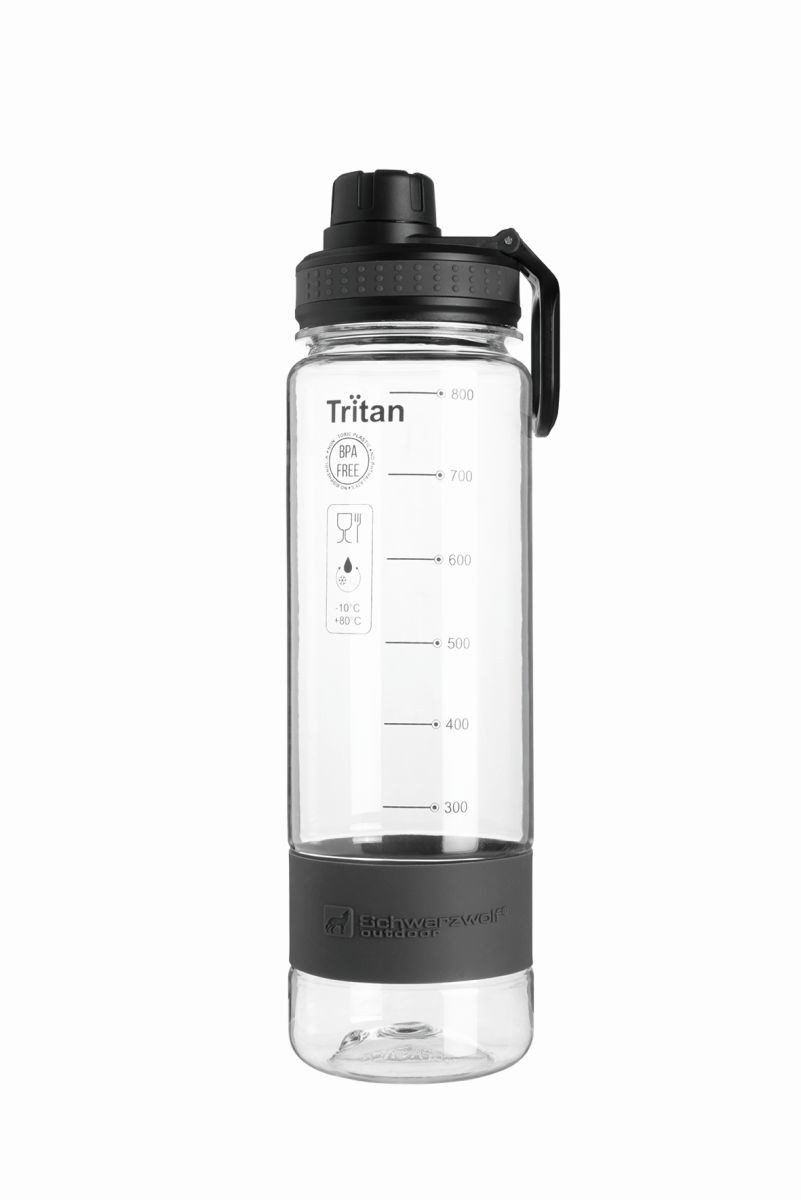 Graue Tritan Trinkflasche mit einer angenehmen, samtigen Oberfläche. Die Trinkflasche ist aus fortschrittlichem Tritan Copolyester und somit BPA (Weichmacher) frei, dabei extrem leicht, geschmacksneutral, lebensmittelecht, wärmebeständig und bruchsicher. Getränke mit einer Temperatur zwischen -10 und 80°C können bedenkenlos verwendet werden. Das Silikonband im unteren Bereich der Flasche vermittelt einen sicheren Griff. Verpackt in einer Schwarzwolf outdoor Geschenkbox. Material: Tritan. Volumen: 0,8 l. Abmessungen: O 7,3 × 27 cm.