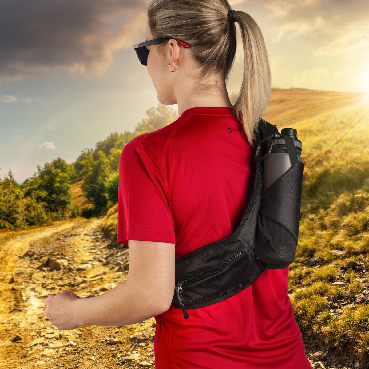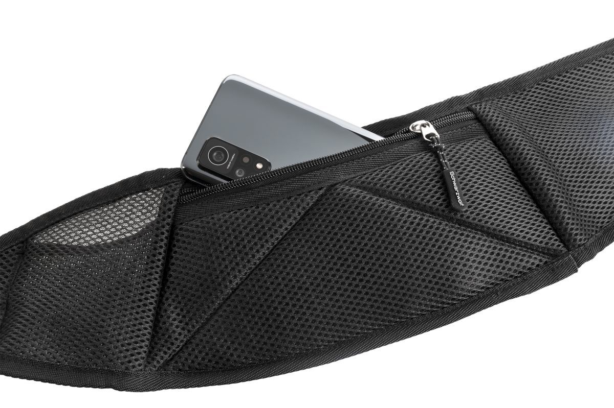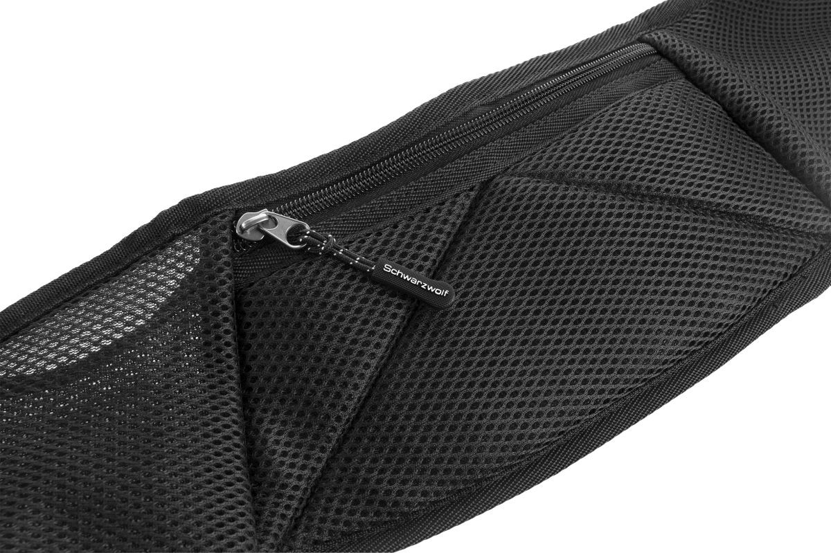 Schwarzwolf outdoor Sportgürteltasche, dank der Sie alle Ihre persönlichen Sachen beim Sport immer dabei haben. Die Gürteltasche beinhaltet eine große Fronttasche für eine Sportflasche, eine kleine Fronttasche mit Reißverschluss für Kreditkarten, etc. und eine hintere Reißverschlusstasche mit 19 × 10 cm. Größe für ein Mobiltelefon. Die Gürteltasche kann auch als Umhängetasche getragen werden. Verpackt in einem Polybeutel mit Papieranhänger. Gewicht: 180 g. Material: RPET 420D Polyurethan-Ripstop. Abmessungen: 59 × 13,5 cm, maximale Gürtellänge (inkl. Gürtel) 130 cm.