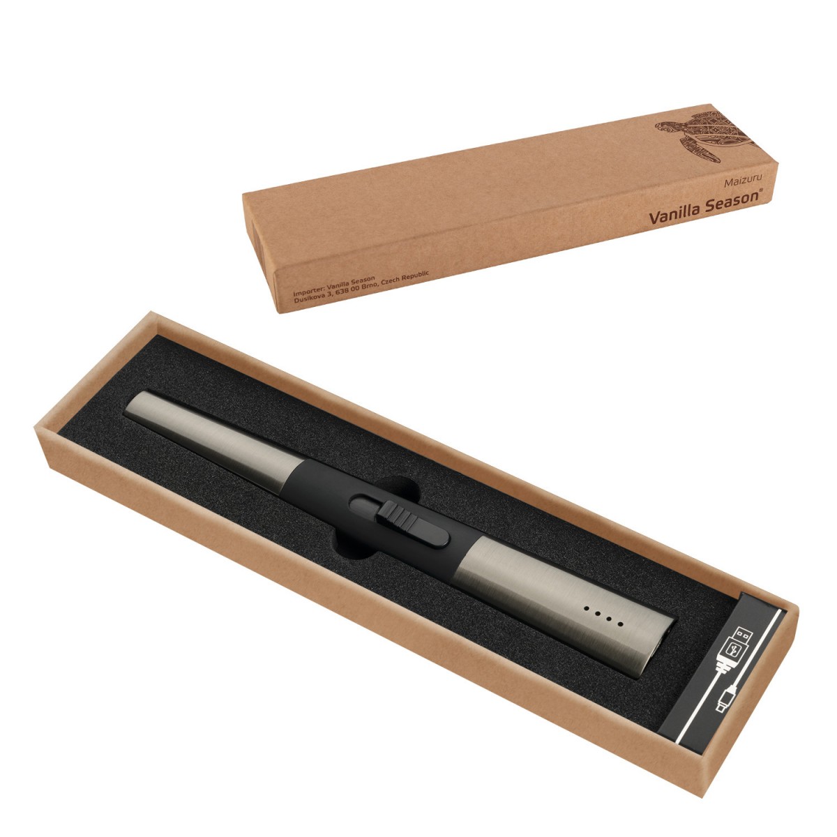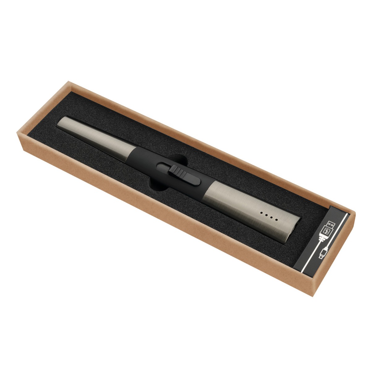 Praktisches, wiederaufladbares Lichtbogen-Feuerzeugmit Ladestandsanzeige, kleinem On-/Off-Schalterund Sicherheitsabschaltung nach 7 Sekunden.Das Stabfeuerzeug kann mit dem mitgeliefertemKabel über jeden USB-Anschluss (mit AusgangDV 5V ± 0,5V, 3.000 mA) geladen werden.Die Ladezeit des 220mAh Akkus beträgtca. 1,5–2 Stunden, das Feuerzeug kann danach100 bis 200 Mal verwendet werden. Verpacktin einer Vanilla Season Geschenkbox.Empfohlene Veredelungstechnik: Laser L1,Tampondruck T3Maximale Veredelungsgröße: 30 × 15 mmAbmessungen: 3 × 20,8 × 1,8 cmVerpackung: 26,1 × 7 × 2,4 cm
