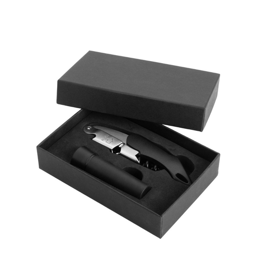 Dieses Weinset enthält einen zweihebeligen Korkenzieher aus Metall mit Kunststoffgriff und einen Vakuumverschluss aus Kunststoff. Der Korkenzieher enthält außerdem einen Kapselschneider. Der Verschluss ist für Standardflaschen geeignet. Verpackt in einer Vanilla Season Geschenkbox. Empfohlene Veredelungstechnik: nur Korkenzieher – Tampondruck T3 auf dem Griff, Laser L1 in das Metallteil Maximale Veredelungsgröße: 30 x 8 mm, 18 x 9 mm Abmessungen: Verschluss 2,4 x 7,5 cm, Korkenzieher 3,4 x 1,5 x 12,5 cm, Verpackung 9,2 x 3,2 x 13,8 cm