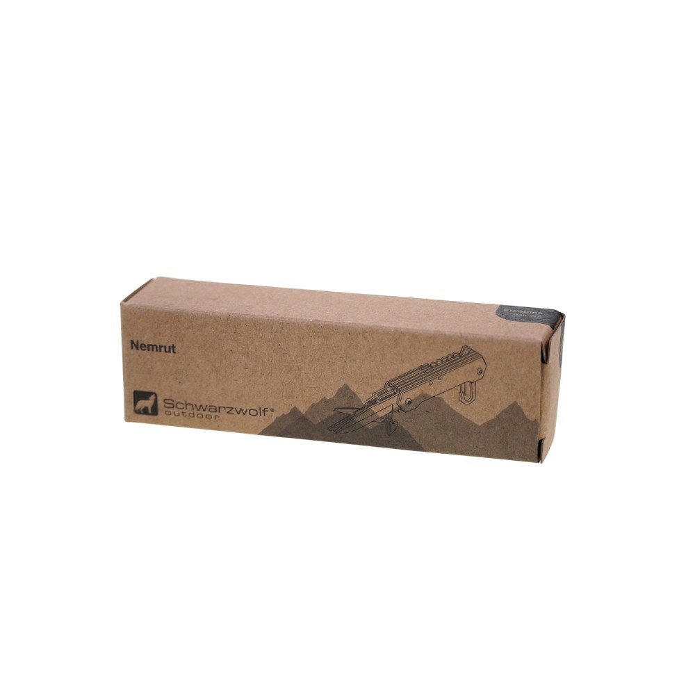 Multifunktionales Schwarzwolf outdoor Taschenmesser. Es enthält 9 Werkzeuge – Messer, Schere, Säge, Korkenzieher, Flaschenöffner, Dosenöffner, Schlitzschraubendreher, Kreuzschlitzschraubendreher und einen Karabiner. Der Griff des Messers ist auf der einen Seite in modernem Rillendesign gehalten und hat auf der anderen Seite eine glatte Oberfläche für Ihr Logo. Verpackt in einer Schwarzwolf outdoor Geschenkbox. Material: Werkzeuge – Edelstahl 2Cr13, Griff – eloxiertes Aluminium. Abmessungen in geschlossenen Zustand: 9,7 × 2,7 × 1,9 cm.
