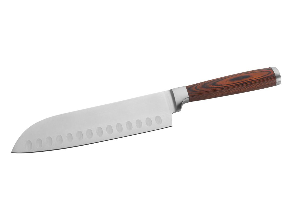 Hochwertiges Set aus zwei exklusiven Küchenmessern, gefertigtaus deutschem Stahl. Eines dieser Messer ist das Santoku-Messer,dessen Name mit drei Tugenden oder Zwecken übersetzt werdenkann. Damit lassen sich Gemüse, Fisch und Fleisch ohne Knochenperfekt schneiden, würfeln und zerkleinern. Seine dünnere, sehrscharfe und glatte Klinge verhindert Saftverlust (ausbluten) beimSchneiden von Fleisch und Obst. Das zweite Messer ist einGemüseschälmesser im gleichen Design. Seine gebogene Klingemacht es sehr einfach, Lebensmittel ohne unnötigen Überschusszu schälen. Verpackt in einer Vanilla Season Geschenkbox.Empfohlene Veredelungstechnik: Laser L1, L2Maximale Veredelungsgröße: Santokumesser 60 × 20 mm,Schälmesser 40 × 8 mmAbmessungen:Santokumesser – Klinge 18 cm, Griff 12,5 cm;Schälmesser – Klinge 8,3 cm, Griff 11,8 cm;Verpackung 34,5 × 11,5 × 3 cm