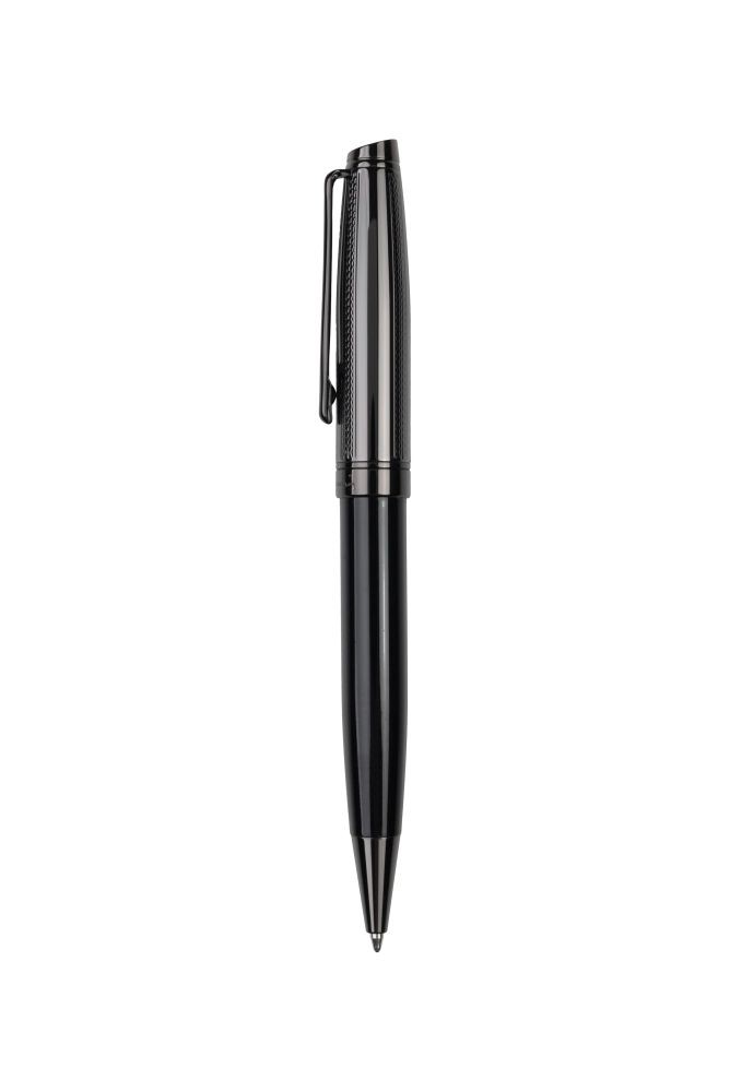 "Pierre Cardin Luxus-Schreibgeräte in elegantem Design. Die Stiftgehäuse sind in glänzendem Schwarz gehalten, die strukturierten Oberteile in Gunmetal. Der Kugelschreiber hat einen Drehmechanismus, die Spitze des Rollers ist durch eine Kappe geschu¨tzt. Der Rollerball enthält eine deutsche Schmidt-Patrone in Blau mit 0,6 mm Spitze, der Kugelschreiber eine blaue Qualitätsmine mit 1 mm Spitze und der Fu¨llfederhalter eine blaue Standardpatrone. Rollerball und Kugelschreiber werden mit einer schwarzen Ersatzmine geliefert. Verpackt in einer Pierre Cardin Luxus Box, versendet mit Echtheitszertifikat. Empfohlene Veredelungstechnik: Lasergravur L1Maximale Druckgröße: 30 × 5 mmAbmessungen: Kugelschreiber 1,4 × 13,9 cm, Tintenroller 1,4 × 13,9 cm, Füllfederhalter 1,4 × 13,9 cm, Verpackung 18,5 × 3,1 × 7,5 cm"