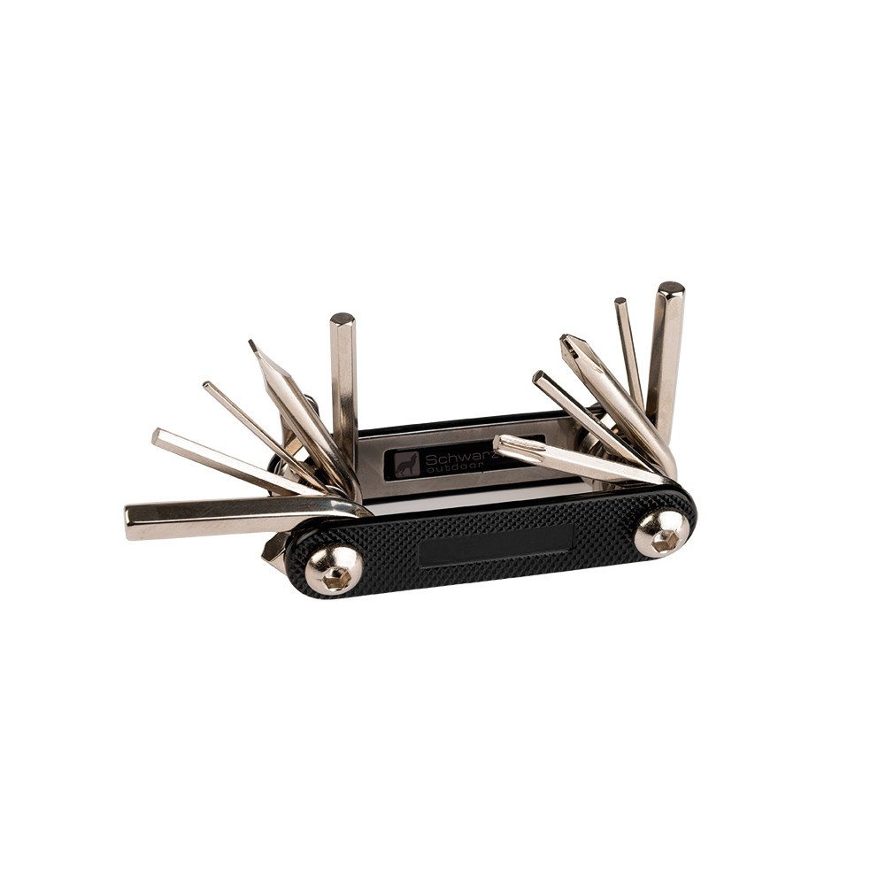 Praktisches, kompaktes Multitool mit 10 Werkzeugen für Radfahrer. Sieben Innensechskantschlüssel, Kreuz- und Schlitzschraubendreher, und ein Torx Schraubendreher. Verpackt in einer Schwarzwolf outdoor Geschenkbox. Material: S/S, Chrom-Vanadium Stahl, Aluminium. Abmessungen: geöffnet: 12,7 × 3,8 × 2 cm; geschlossen: 7,3 × 3,8 × 2 cm.