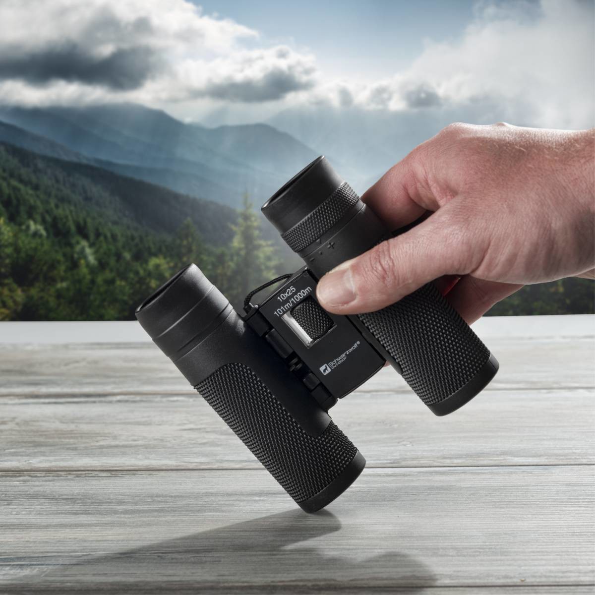 Schwarzwolf outdoor Fernglas mit 10 × 25 Optik, Sehfeld bei 1000 m: 101, Blickwinkel 5,8 °, mittlere Austrittspupille 11 mm, kürzeste Naheinstellgrenze 3 m. Verpackt ist das Fernglas in einem Neoprenetui mit Umhängeband in einer Schwarzwolf outdoor Geschenkbox. Abmessungen: 11 × 11,5 × 3,5 cm.