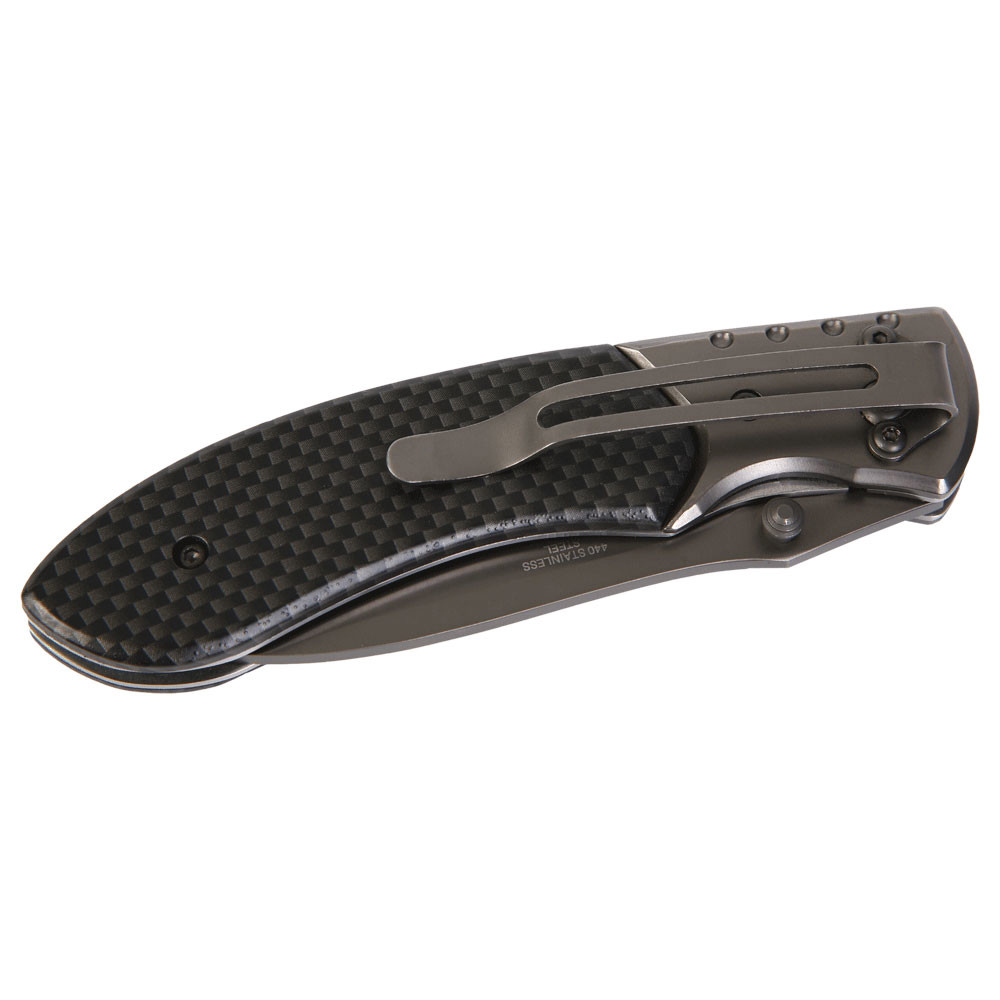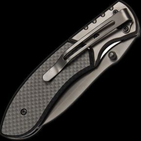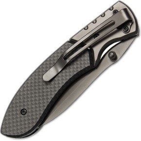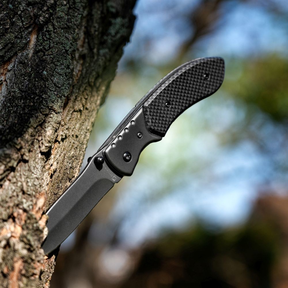 Modernes Taschenmesser mit Gürtelclip. Die Klinge ist mit einer grauen Beschichtung versehen, die Griffschalen sind in Karbon Optik gehalten. Verpackt in einer Schwarzwolf outdoor Geschenkbox. Abmessungen im geschlossenen Zustand: 11,2 × 3 × 1,8 cm.