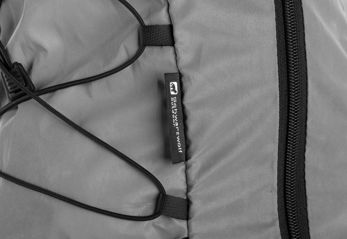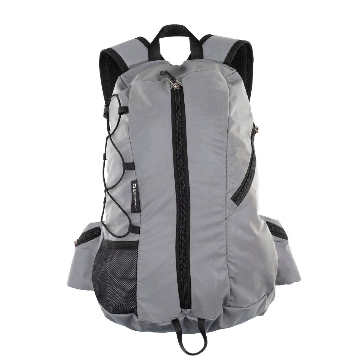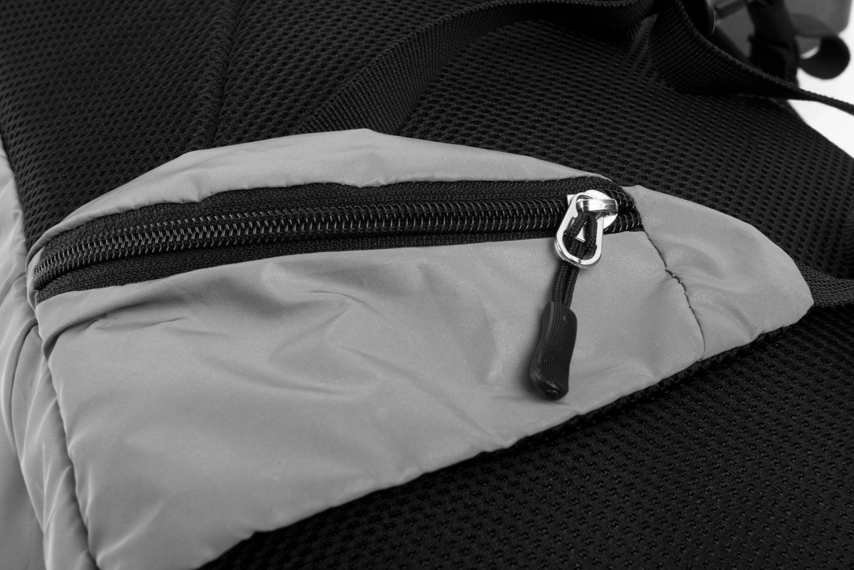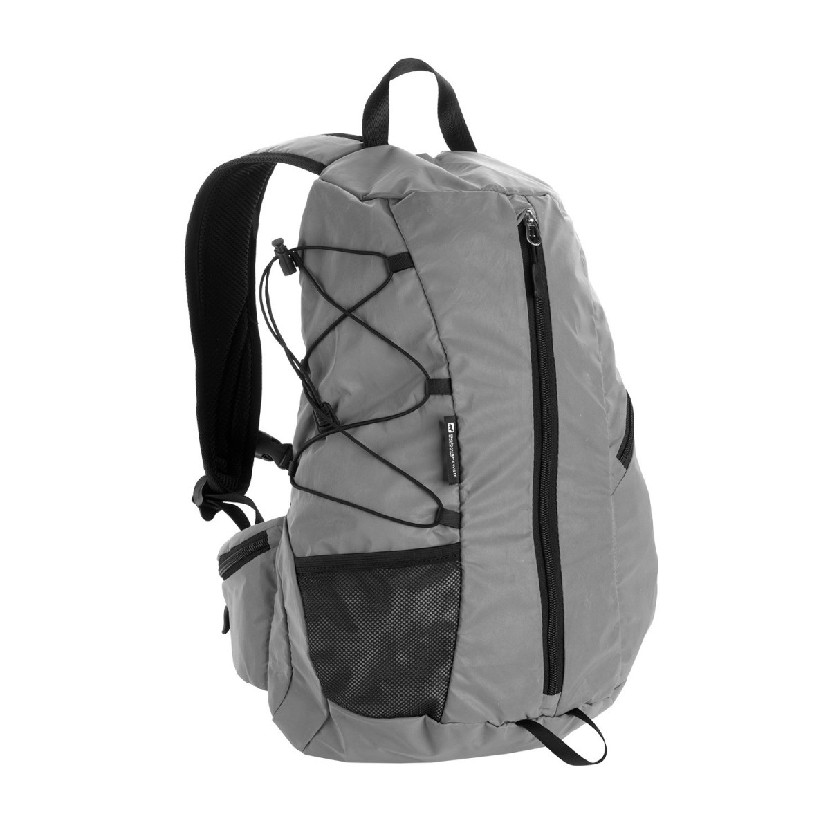 Reflektierender Rucksack für ausgezeichnete Sichtbarkeit. Bei normalem Tageslicht erscheint er grau, trifft Licht auf die Oberfläche wird der Rucksack durch die starke Reflexion unübersehbar. Das Material erfüllt die Anforderungen der Norm EN ISO 20471 für Warnschutzkleidung. Der Rucksack hat einen gepolsterten Rücken und Schultergurte, ein Hauptfach mit Frontzugang und eine weitere kleine Reißverschlusstasche. Dazu noch eine Netztasche an der Seite, im Hüftgurt befinden sich zwei kleinere Reißverschlusstaschen. Volumen: 20 l. Gewicht: 355 g. Material: 100% Polyester mit Reflexions-Beschichtung. Abmessungen: 28 × 14 × 45 cm.